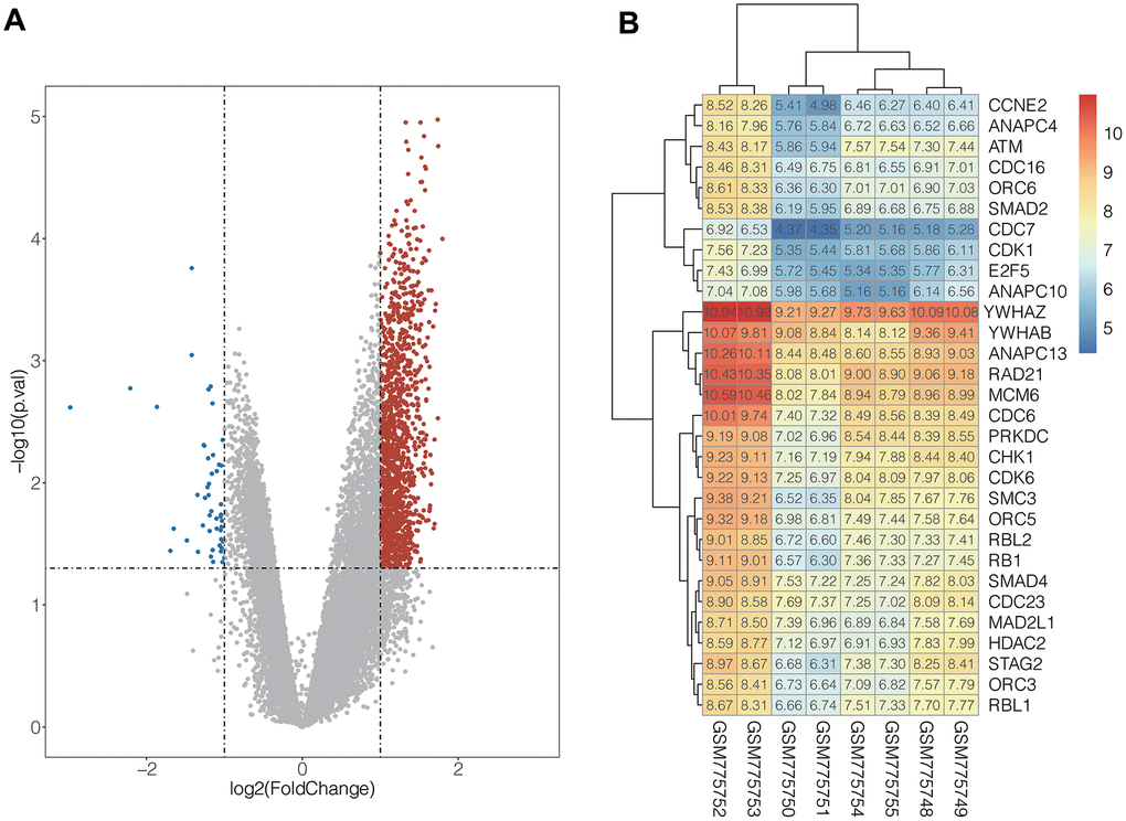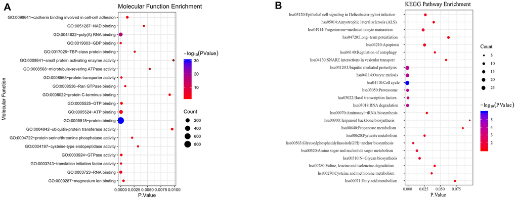 To understand biological function roles of the above identified DEGs, the online biological tools DAVID database and KEGG database were used for enrichment analysis. Top enriched GO terms and KEGG pathways were listed in Table 1 and Table 2 (Supplementary Table 2). In molecular function analysis (Figure 2A), differential genes are mainly concentrated in protein binding. In KEGG analysis (Figure 2B), it was found that differential genes are mainly involved in cell cycle pathways. The volcano map of all differentially expressed genes in cell cycle pathway is shown in Figure 1B (Supplementary Table 1).