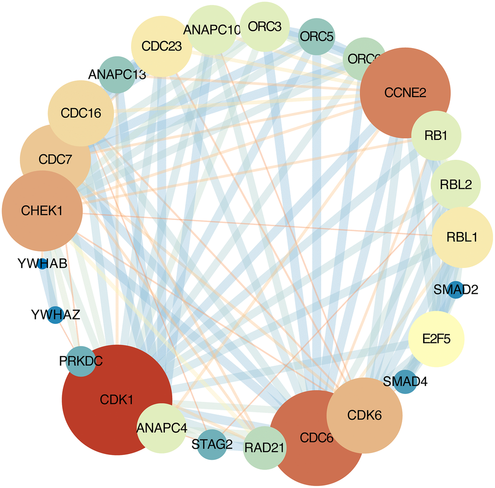 PPI network analysis of all the DEGs in cell cycle pathway on the STRING online database (http://string-db.org) [13]. The PPI correlation coefficient was imported into Cytoscape 3.5.1 for visualization [40]. Each node in Cytoscape represents a gene, the edges width between the nodes represent the interaction between them, and the degree represents the number of edges.