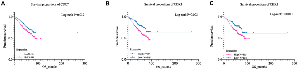 GSE24080 was selected for overall survival analysis by using survival package in Rstudio, 313 MM patient samples with clinical and overall survival information were divided into high expression group and low expression group according to the average expression of each gene. The result suggested that the expression of cell division cycle 7 (CDC7), cyclin-dependent kinase 1 (CDK1), and checkpoint kinase 1 (CHK1) genes among cell cycle pathway were closely related with the overall survival time of patients, and the OS of the low-expression group was significantly prolonged than that of the high-expression group (CDC7, P = 0.032, CDK1, P = 0.003; CHK1, P = 0.011) (Figure 4A–4C). However, due to the lack of risk stratification of MM patients in the GSE24080 dataset, the relationship between these three genes and MM risk stratification cannot be calculated.
