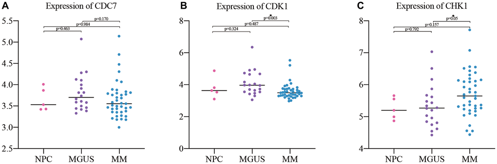 The GSE47552 dataset was selected to verify the expression of CDC7, CDK1, and CHK1 at different stages of plasma cell diseases. The results showed that there was no significant difference between them when compared MM with NPC and MGUS, but the expression of CHK1 has statistically significant difference compared MM with NPC and MGUS (Figure 5A–5C).