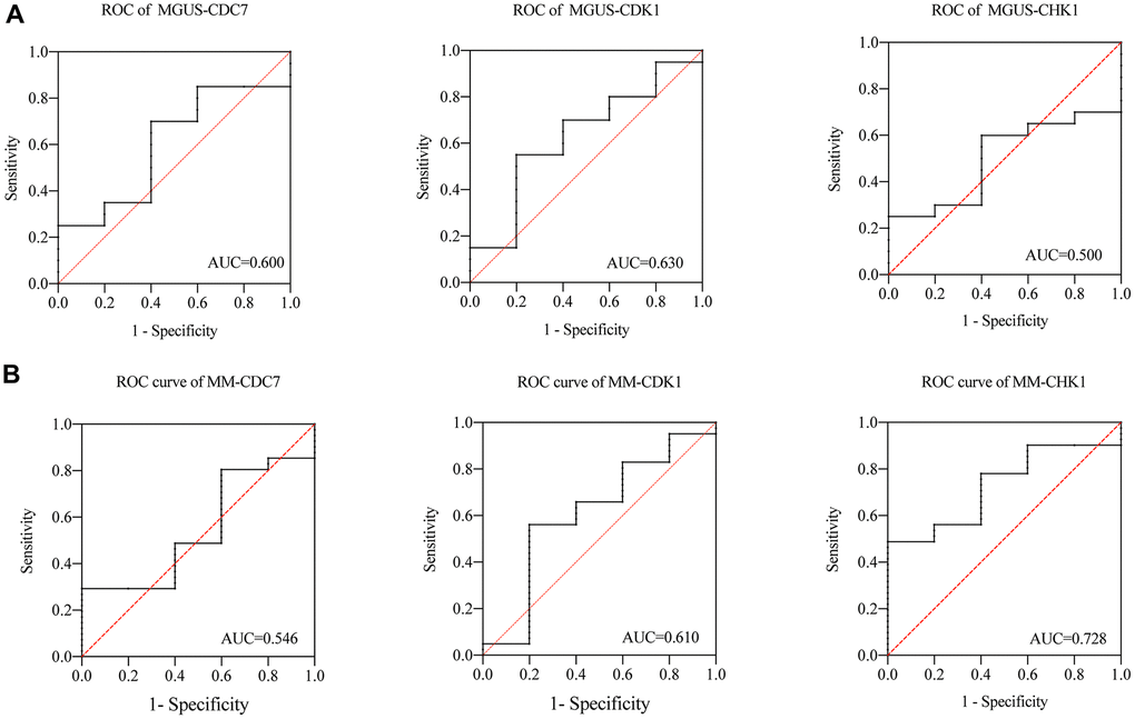 we subsequently analyzed the ROC of MGUS and MM. As shown in the Figure 6, in the MGUS, the area under the curve (AUC) of CDC7, CDK1, and CHK1 are 0.600, 0.630, and 0.500 (Figure 6A). In MM, the AUC of CDC7, CDK1, and CHK1 are 0.546, 0.610, and 0.728 (Figure 6B). That means the diagnostic value of CDC7 and CDK1 in MGUS and MM is not significantly different, while CHK1 has an apparent difference between MGUS and MM.