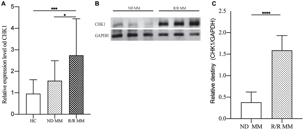 To verify our findings, we tested the MM patients mRNA expression of CHK1 and found that there was no statistical difference between HC and ND MM, but there are significant statistical differences when compared R/R MM with HC (P=0.0009) and ND MM (P=0.0267, Figure 7A). Then we measured the protein expression of CHK1 between ND MM and R/R MM. The results showed that the expression of CHK1 in the R/R MM was obviously increased than that of ND MM (P<0.0001, Figure 7B, 7C).