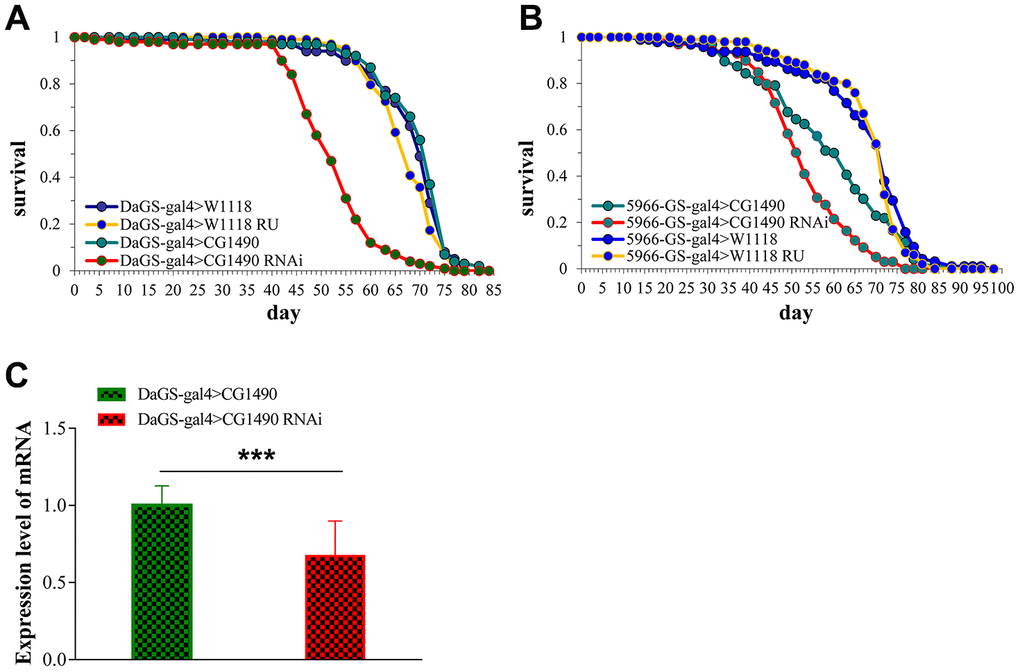 The survival time was recorded for the selected Drosophila. During the experiment, the culture medium of Drosophila was replaced every Monday, Wednesday and Friday until the experimental Drosophila had all died, and a survival curve was constructed according to the Drosophila survival data. Statistical significance analysis was performed using the log-rank test. More than two independent experiments were carried out for most of the lifespan assays.