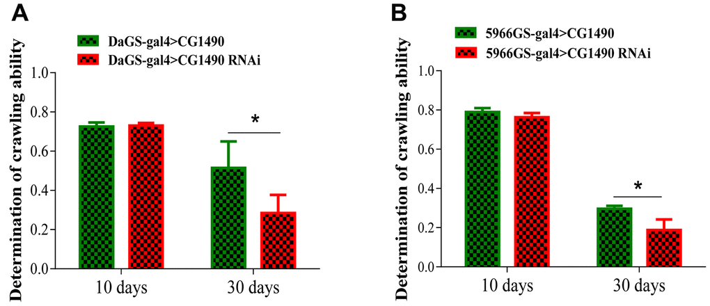 A Drosophila was placed in a tube, which was gently shaken so that the fruit fly went into the bottom of the tube. The Drosophila climbed freely for 45 s and was then photographed. The assay was repeated three times with independent groups of Drosophila. The speed was calculated by the formula: PI=(ntot+ntop-nbot)/2/ntot (ntot indicates all Drosophila, ntop indicates the Drosophila at the top of the tube, nbot indicates the Drosophila at the bottom of the tube, and PI stands for climbing ability).