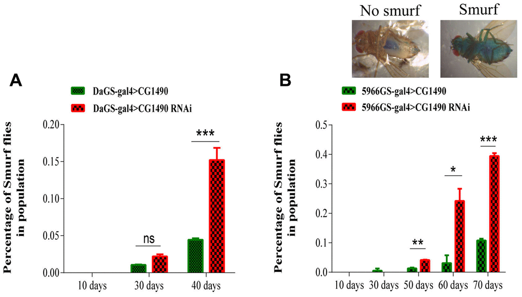 Blue dye No. 1 was added to the culture medium for the intestinal integrity tests. When the Drosophila were maintained on the dyed medium for 9 hours, if the intestinal function was damaged, the dye entered the body through the intestine, making the whole abdomen and even the whole body blue. At this point, the Drosophila are termed "smurfs". In contrast, if the intestinal tract function was intact, the Drosophila showed no change.