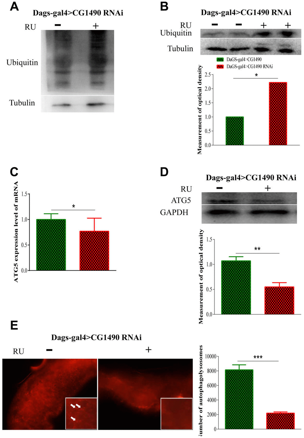 Fruit fly total protein was extracted with a Cell Total Protein Extraction Kit (Sangon Biotech C510003). Aliquots of 40-100 μg protein extract were separated by gel electrophoresis. The proteins were then transferred to polyvinylidene fluoride membranes. The primary antibodies used were as follows: ATG-5 antibody (NOVUS NB110-53818SS), UB antibody (Cell Signaling Technology 3936S), α-tubulin antibody (Sigma T9026), and GAPDH antibody (Servicebio GB11002). All western blot experiments were repeated at least twice.