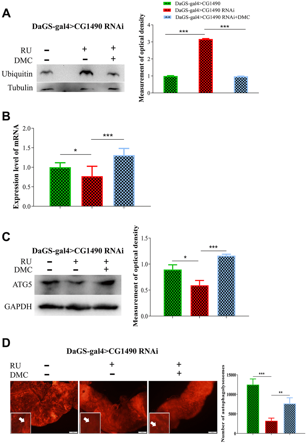 To test the effect of DMC on the protein degradation pathway, we investigated changes in the levels of protein ubiquitination, ubiquitin, autophagy, and atg5 mRNA in Drosophila. We found that dusp7-knockdown flies had significantly increased levels of protein ubiquitination and ubiquitin protein, but the addition of DMC decreased the level of ubiquitin protein (Figure 8A). Knockdown of dusp7 significantly decreased the protein and mRNA expression levels of atg5, but the addition of DMC increased these levels (Figure 8B, 8C). Additionally, DMC could increase autolysosomes in the midgut epithelial cells (Figure 8D). The results suggest that DMC can enhance autophagy and ubiquitination.