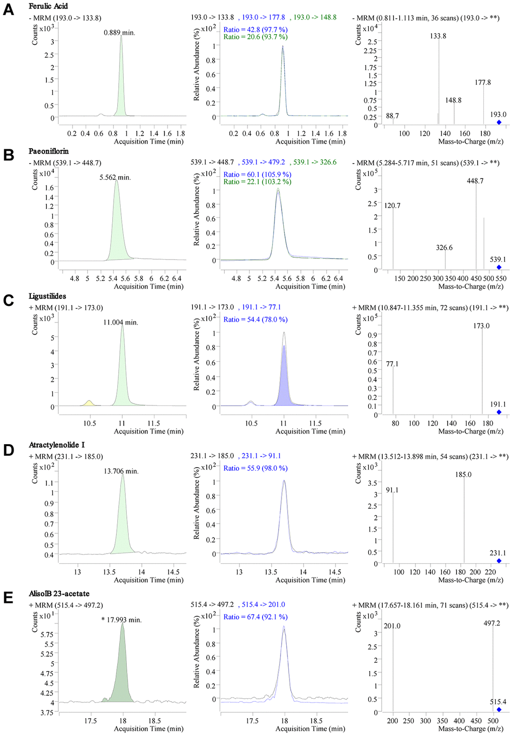 Five quality standards (ferulic acid, paeoniflorin, ligustilide, atractylenolide I, and alisol B 23-acetate) in DSS freeze-dried powder were identified by liquid chromatography-tandem mass spectrometry (LC-MS/MS). The chromatogram results showed that the retention time of ferulic acid, paeoniflorin, ligustilide, atractylenolide I, and alisol B 23-acetate were 0.889min, 5.562min, 11.004 min, 13.706 min, and 17.993 min, respectively (Figure 1A–1E). The quantitative results of the mass spectrometry showed that the content of ferulic acid, paeoniflorin, ligustilide, atractylenolide I, and alisol B 23-acetate in DSS were 148.2 mg/kg, 5320 mg/kg, 400.7 mg/kg, 7.2 mg/kg, and 26.7 mg/kg, respectively(Figure 1A–1E).
