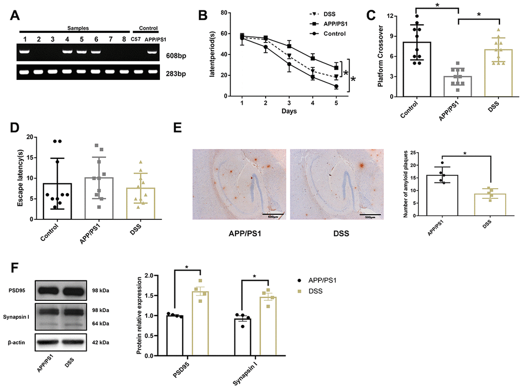 The offspring mice were weaned at the age of 3 weeks, and tail biopsies were collected for genotype identification on the second day after weaning. We used the gene-specific primer PS1 (608 bp) and reference gene primer GAPDH (283 bp) to detect mouse genotype, as shown in Figure 2A. The samples numbered 1, 4, 5, 6, and the positive control sample had a bright band at around 283 bp and 608 bp, respectively. Other specimens and the negative control sample had only one bright band at around 283 bp. APP/PS1 mice contain human transgenes for both APP bearing the Swedish mutation and PSEN1 containing an L166P mutation, both under the control of the Thy1 promoter [14]. Therefore, the samples of mice amplified with PS1 genes were thought to have been successfully transfected with APP and PS1. A Morris water maze test was conducted on mice at 7 months of age, as shown in Figure 2B–2D. Wild-type C57BL/6J mice (control) easily learned the hidden location during a 5-day trial, but APP/PS1 mice showed an inability to find the platform. Notably, the DSS-treated APP/PS1 mice showed significant improvement in learning and memory function compared with the untreated APP/PS1 mice, as evidenced by a reduction in the latency of avoidance (Figure 2B). Similar to the control mice, DSS-treated APP/PS1 mice crossed over the previous platform location more frequently than untreated APP/PS1 mice (Figure 2C). In the visible platform version of the Morris water maze test, DSS-treated and untreated APP/PS1 mice demonstrated similar behaviors (Figure 2D).