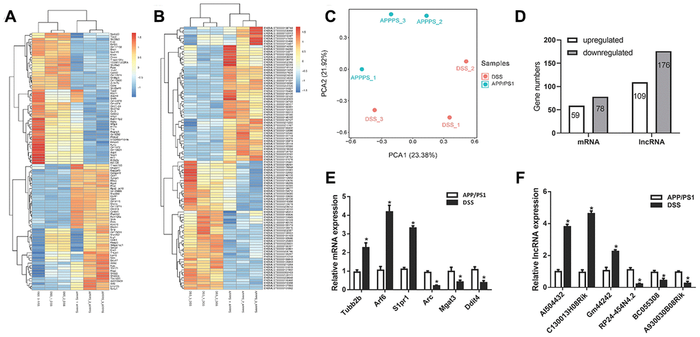RNA sequencing was used to detect the LncRNA expression profile in two groups (DSS-treated APP/PS1 mice and APP/PS1 mice). The transcriptome analysis results showed that 285 differentially expressed LncRNAs were identified, of which 109 were upregulated and 176 were downregulated. 110 of the differentially expressed LncRNAs passed the False Discovery Rate (FDR) thresholds with the corrected P < 0.05, of which 47 were upregulated and 63 were downregulated. In addition, it was found that 137 mRNAs were differentially expressed, including 59 upregulated and 78 downregulated (Figure 3D). These differentially expressed LncRNAs and mRNAs were shown as a heatmap (Figure 3A, 3B). Principal component analysis (PCA) showed that there were significant differences in gene expression profile between after DSS - treated and untreated in APP/PS1 mice (Figure 3C). However, intra-group differences still exist, and we should focus on those genes that are relatively high in expression. So, in order to verify the transcriptome analysis results, we randomly selected four LncRNAs and four mRNAs from differentially expressed LncRNA and mRNA transcripts for determining their expression using qPCR (Figure 3E, 3F). By comparison, we found that the qPCR results were similar to the RNA sequencing results.