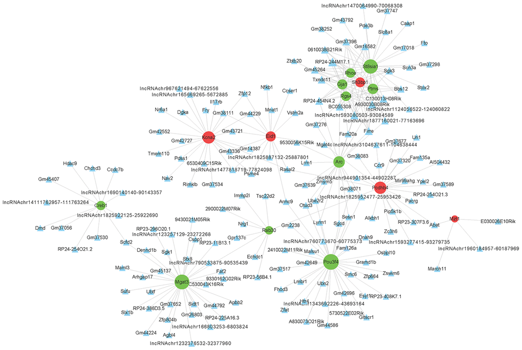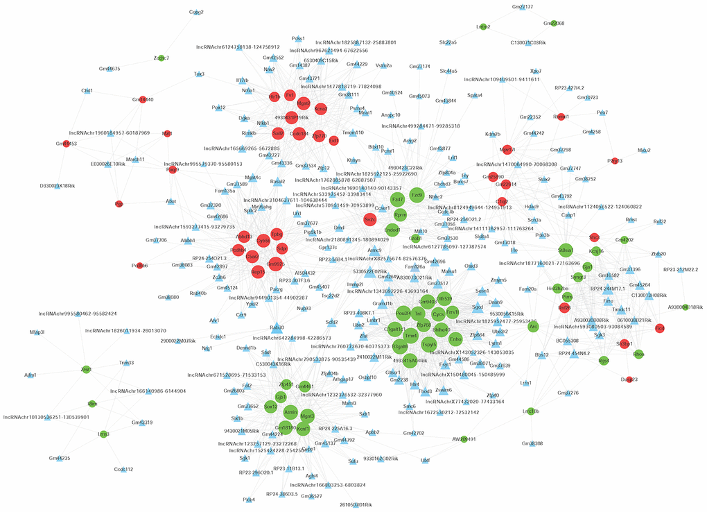 To determine the function of differentially expressed LncRNAs, we investigated their correlation with each maladjusted mRNA. We identified 1528 co-expression relationships between 82 mRNAs and 242 LncRNAs (Figure 4). In addition, we also focused on the analysis of differentially expressed mRNAs related to AD (Table 1) and their co-expression relationship with LncRNA. The co-expression network is shown in Figure 5. Circular nodes represent mRNAs, the inverted triangle nodes represent LncRNAs, and the size of the node represent the degree of the node in the network. Usually, a high degree indicates an important node in the network; LncRNA:chr5:93080503-93084589, LncRNA A930030B08Rik, and LncRNA Firre showed the widest correlations (degree = 7), suggesting that they are involved in the regulation of multiple gene expressions. Similarly, mRNA Pou3f4 and mRNA Mgat3 were 34 and 30 degrees, respectively, indicating that their dysregulated expression profiles were associated with multiple LncRNAs.