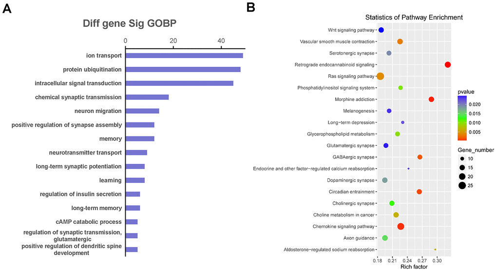 We selected co-expressed genes for functional enrichment analysis to further explore the biological functions affected by the co-expression relationship of LncRNA and mRNA (Figure 6). The GO enrichment analysis results showed that the co-expressed genes were mainly involved in ion transport, protein ubiquitination, intracellular signal transduction, neuron migration, memory, learning, long-term synaptic potentiation, and regulation of glutamatergic synaptic transmission (Figure 6A). In addition, the pathway enrichment analysis results showed that the common enriched pathways related to co-expressed genes included the Wnt and Ras signaling pathways, glycerophospholipid metabolism, phosphatidylinositol signaling system, long-term depression, glutamatergic synapse, dopaminergic synapse, and cholinergic synapse (Figure 6B).