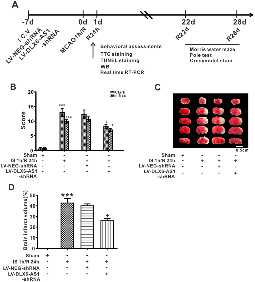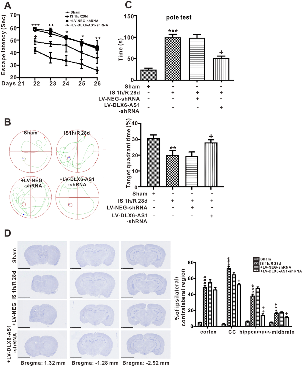Mice were treated with cerebral ischemia (IS) / reperfusion (R) on day 7 after being injected icv with lentivirus DLX6-AS1-shRNA1, and then DLX6-AS1 expression was first measured in the ischemic cerebral hemisphere. As shown in Supplementary Figure 1A, DLX6-AS1 was upregulated after ischemia for 1 h (IS 1 h) and following reperfusion for 24 h (R 24 h) (1.72 ± 0.19 arbitrary units (a.u.)) compared with that of the sham group (1.04 ± 0.04 a.u., P < 0.05). To establish the actions of DLX6-AS1 after cerebral I/R, the expression of DLX6-AS1 of the mouse brain should been interrupted. There were three interrupted sequences were designed and transfected into N2a cells. The results showed that DLX6-AS1 shRNA1 played the best interrupted effect on DLX6-AS1 expression (Supplementary Figure 1B, the results of other two shRNA were not shown here). Therefore, DLX6-AS1 shRNA sequence was chose for the further experiment. The mouse was injected icv with LV-DLX6-AS1-shRNA or LV-NEG on day 7 before cerebral I/R. and then neurological functions were evaluated in Morris water maze and pole tests from day 22 through day 28 after cerebral I/R. In comparison to the LV-NEG group, DLX6-AS1 expression was successfully downregulated (0.29 ± 0.06 a.u., Supplementary Figure 1A) after icv injection with LV-DLX6-AS1-shRNA. Behavioral assessments were used to assess neurological functions and TTC staining to determine the volume of each lesion.