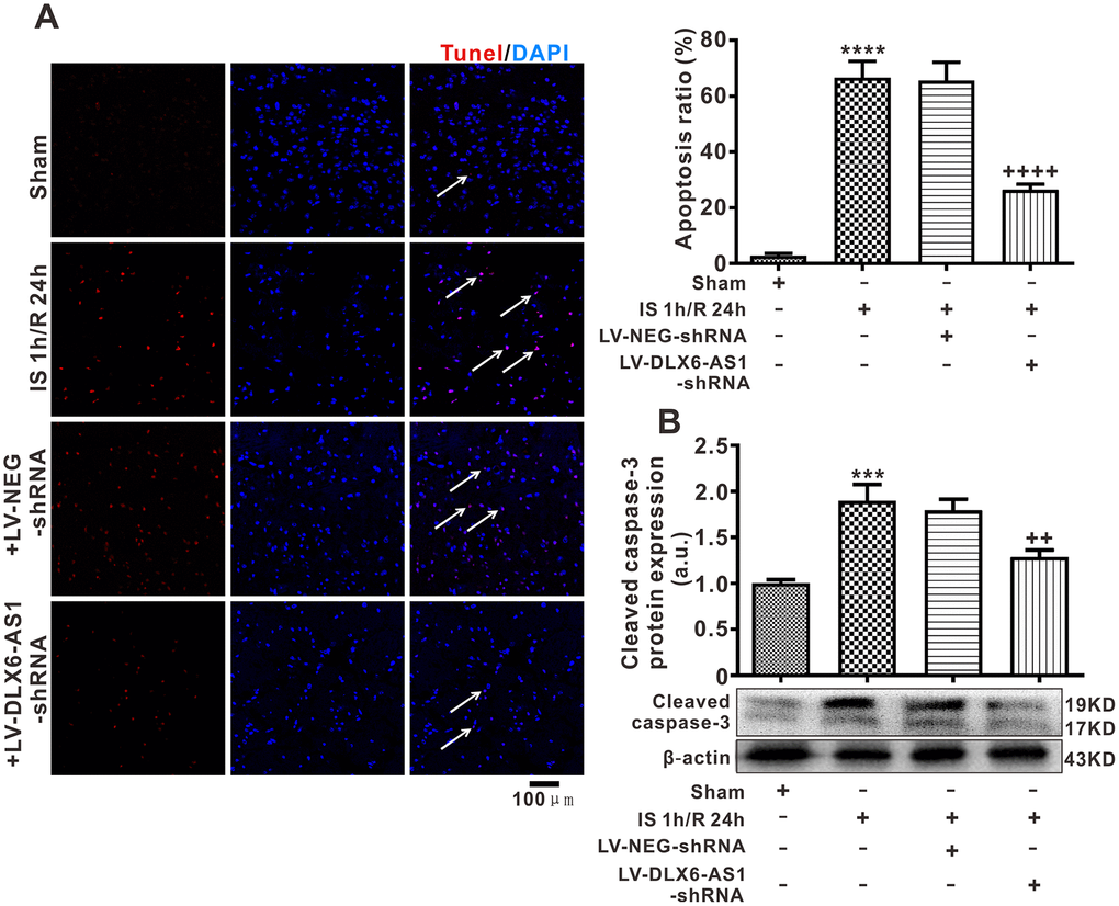 To detect the actions of DLX6-AS1 on neuronal apoptosis triggered by cerebral I/R, TUNEL staining and the cleaved expression of caspase-3 protein in ischemic cerebral hemispheres were determined in vivo. In comparison with the sham-operated group of mice, the ratios of neuronal TUNEL-positive cells (44.7 ± 4.5%, P < 0.001) and cleaved caspase-3 (1.87 ± 0.18, P < 0.01) were significantly higher in the IS 1 h/R 24 h group (Figure 3A, 3B). However, the ratio of TUNEL-positive cells and cleaved caspase-3 protein in the LV-DLX6-AS1-shRNA+IS 1 h/R 24 h group was significantly lower in comparison with solely the IS 1 h/R 24 h group (Figure 3A, 3B). These data revealed that silencing of DLX6-AS1 inhibited neuronal apoptosis induced by brain ischemia/reperfusion.
