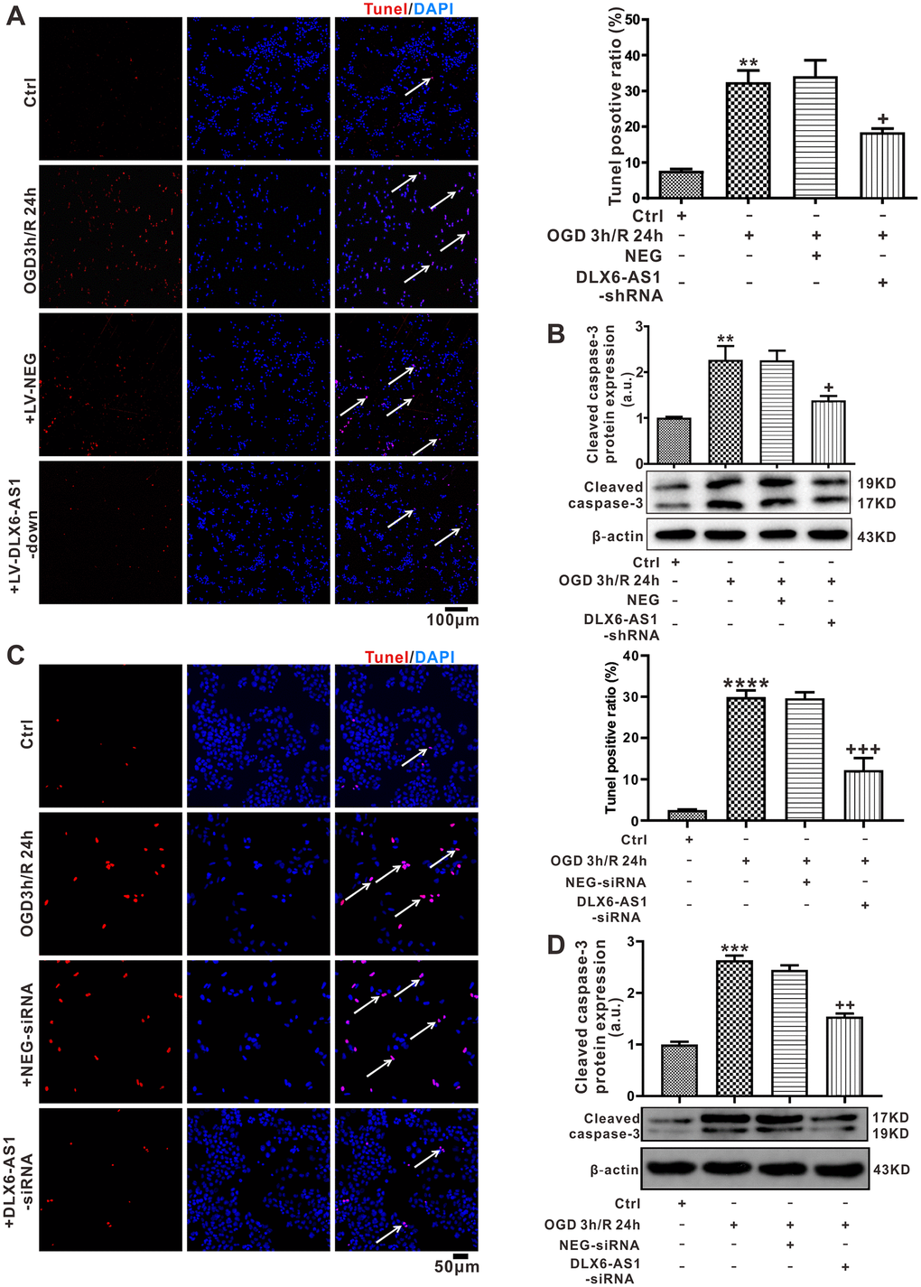 To confirm the actions of DLX6-AS1 on neuronal apoptosis, N2a cells were transfected with DLX6-AS1-shRNA for 48 h and then exposed to OGD for 3 h; followed by 24 h re-oxygenation. Apoptotic cell numbers (32.48% ± 3.26%) and expression levels of cleaved caspase-3 (2.27 ± 0 .30) elicited by OGD/R were greater than for untreated control cells (7.64% ± 0.56%, 1.01 ± 0.02, Figure 4A, 4B). Downregulation of DLX6-AS1 levels with DLX6-AS1-shRNA significantly decreased cell apoptosis (18.48 ± 1.03) and cleaved caspase-3 expression (1.38 ± 0.10) induced by OGD/R (Figure 4A, 4B). Consistent with the N2a cells finding, transduction of SH-SY5Y cells with DLX6-AS1 siRNA (Supplementary Figure 2B) significantly reduced apoptotic cell numbers and decreased the expression of apoptotic proteins cleaved caspase-3 (Figure 4C, 4D) to inhibited OGD-R-induced apoptosis. The data indicated that silencing of DLX6-AS1 also inhibited neuronal apoptosis induced by OGD/R in vitro.