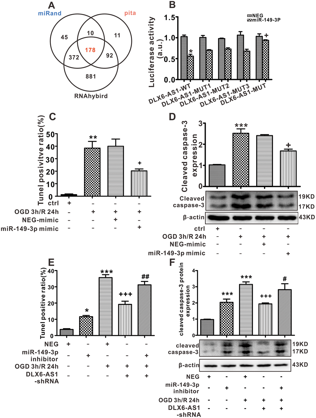 The data from TUNEL staining and western blotting revealed that when miR-149-3p was overexpressed there was a significant reduction of apoptosis in OGD/R N2a cells (ratio of TUNEL-positive cells: 20.25% ± 1.57%, cleaved caspase-3: 1.68 ± 0.09) compared to NEG+OGD 3 h/R 24 h cells (ratio of TUNEL-positive cells: 39.99% ± 5.76%, cleaved caspase-3: 2.41 ± 0.04; Figure 5C, 5D). However, after transfection with an miR-149-3p inhibitor, the degree of cellular apoptosis (the ratio of TUNEL-positive cells: 11.63% ± 0.73%, cleaved caspase-3: 2.04 ± 0.20) was increased in comparison to the NEG group (i.e., the ratio of TUNEL-positive cells: 3.75% ± 0.513%, cleaved caspase-3: 0.97 ± 0.02, Figures 5C, 5D). As previously demonstrated, silencing of DLX6-AS1 reduced the degree of apoptosis of neurons elicited by OGD/R. It is noteworthy that in cells transfected with DLX6-AS1-shRNA and miR-149-3p inhibitors exposed to OGD/R (the ratio of TUNEL-positive cells: 31.21% ± 2.11%, cleaved caspase-3: 2.82 ± 0.37), apoptosis increased more than in the DLX6-AS1-shRNA+OGD 3-h/R 24-h group (ratio of TUNEL-positive cells: 19.17% ± 1.98%, P < 0.01; cleaved caspase-3: 1.94 ± 0.06, P < 0.05, Figure 5E, 5F). The data showed that a miR-149-3p inhibitor reversed the anti-apoptotic effect of DLX6-AS1-shRNA in cells treated with OGD/R, indicating that miR-149-3p may well be a target of DLX6-AS1.