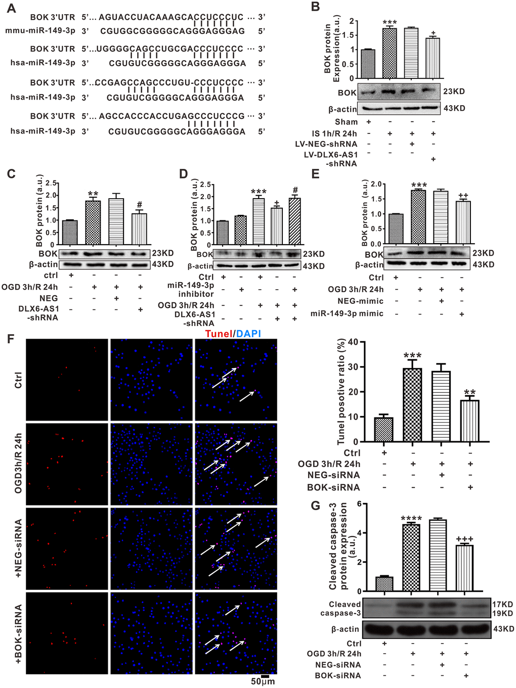 Next we determined the effect of BOK on neuronal apoptosis. We knocked down the expression of BOK in N2a cells via siRNA transfection and detected the effects of BOK on the apoptosis of N2a cells. BOK expression was successfully decreased by shRNA-1 (Supplementary Figure 4C). As expected, knockdown of BOK expression significantly inhibited OGD/R induced the ratio of TUNEL-positive cells (Figure 6F) and cleaved caspase-3 expression (Figure 6G) compared with that NEG treatment group. This finding was confirmed that BOK could promote OGD/R induced apoptosis. Taken together, these data suggest that DLX6-AS1 upregulates BOK expression by blocking miR-149-3p in OGD/R treatment N2a cells.