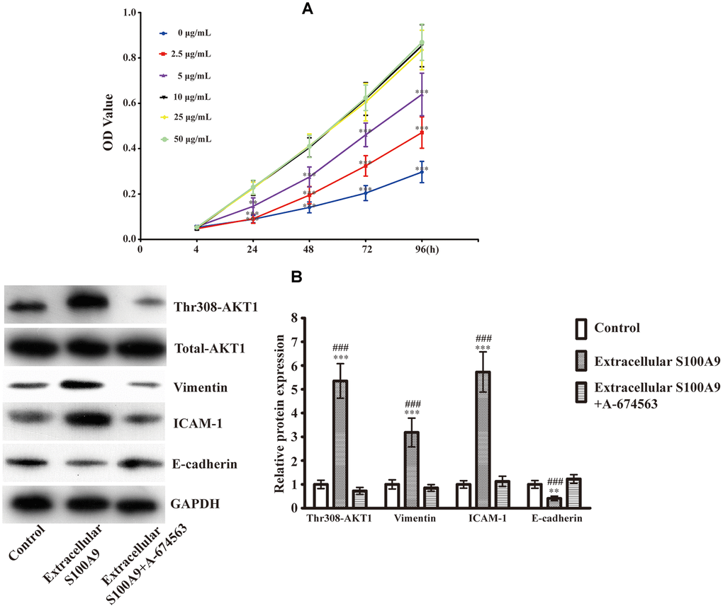 Previous studies have unveiled that 10μg/mL recombinant human S100A9 protein promoted tumor development [23–25]. We also found that the cell viability of HP75 was induced in a S100A9 concentration-dependent manner (0, 2.5, 5, 10μg/mL). However, extracellular S100A9 did not further accelerate HP75 proliferation upon increasing its concentration from 10 to 50μg/mL (Figure 1A). Accordingly, 10μg/mL recombinant human S100A9 protein was used for subsequent experiments. Western blot analysis demonstrated that extracellular S100A9 raised phospho-AKT1Thr308, Vimentin and ICAM-1 (Intercellular cell adhesion molecule-1), coupled with downregulation of E-cadherin. When A-674563 (AKT1 inhibitor) was added, elevated Vimentin and ICAM-1 were suppressed partially. Conversely, the levels of E-cadherin were increased under these conditions (Figure 1B). These data suggest that extracellular S100A9 triggers off EMT of PA in an AKT1Thr308-dependent manner.