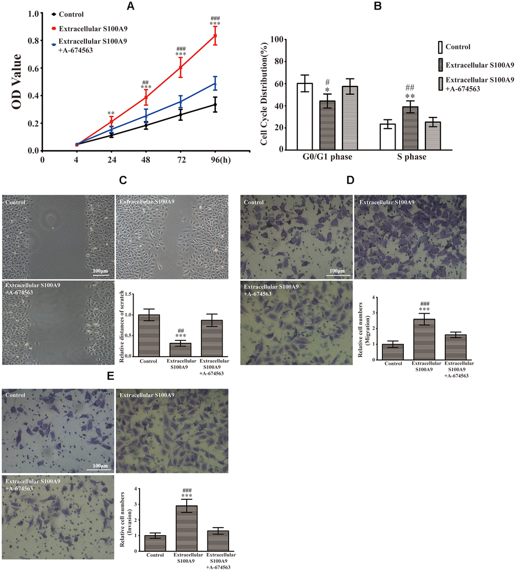 The CCK-8 results illuminated that extracellular S100A9 promoted HP75 proliferation after 24, 48, 72 and 96h (Figure 2A). Flow cytometric analysis indicated that the percentage of cells in the G0/G1 phase was lower in HP75 cells treated with extracellular S100A9 than in the control group, while the percentage of cells that in the S phase was higher (Figure 2B). However, there was no significance difference in the percentage of cells that were in the G2 phase (data not shown). Moreover, the transwell and wound-healing assay also illustrated that extracellular S100A9 heightened migration and invasion of HP75 cells after 16h (Figure 2C–2E). Interestingly, extracellular S100A9-induced proliferation, cell cycle progression, migration and invasion were counteracted by the addition of A-674563 in HP75 cells (Figure 2A–2E).