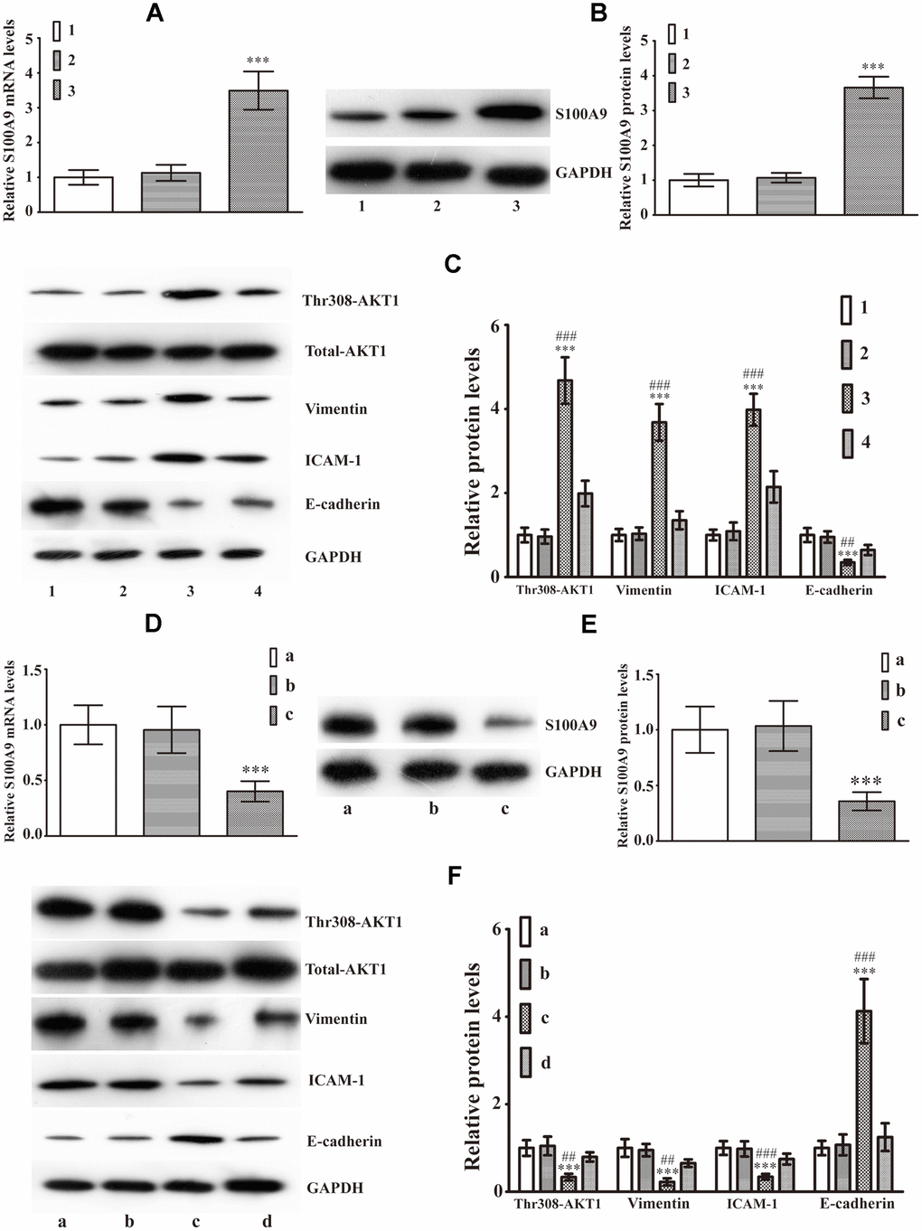 Cells were harvested and lysed using RIPA lysis buffer containing 1%PMSF and 0.1% phosphatase inhibitor. The protein samples (30μg) were separated by SDS–PAGE and transferred onto PVDF membranes. After incubation with primary antibodies overnight at 4°C, including S100A9 (1:200), GAPDH (1:1000), total-AKT1 (1:1000), phospho-AKT1Thr308 (1:200), E-cadherin (1:600), Vimentin (1:800), and ICAM-1 (1:600), the PVDF membranes were washed three times with TBST buffer and incubated with a secondary antibody (1:5000) for 50min at 37°C. Next, the membranes were washed three times in TBST buffer, and the amount of protein in each band was determined using ECL reagent and quantified using the Quantity One 4.6 computer software (Bio-Rad, Hercules, California).