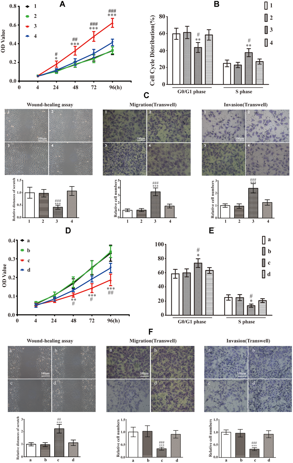 Cells (2×105) were implanted in 6-well plates and cultured to reach 80% confluence. Wounds were created by scraping the cells with a sterile 10μl sterile pipette tip. Then, these cells were washed with PBS and cultured under different conditions for 16h. The widths between the edges of the injured monolayer were quantified to assess migrating distances using the T-Scratch software.