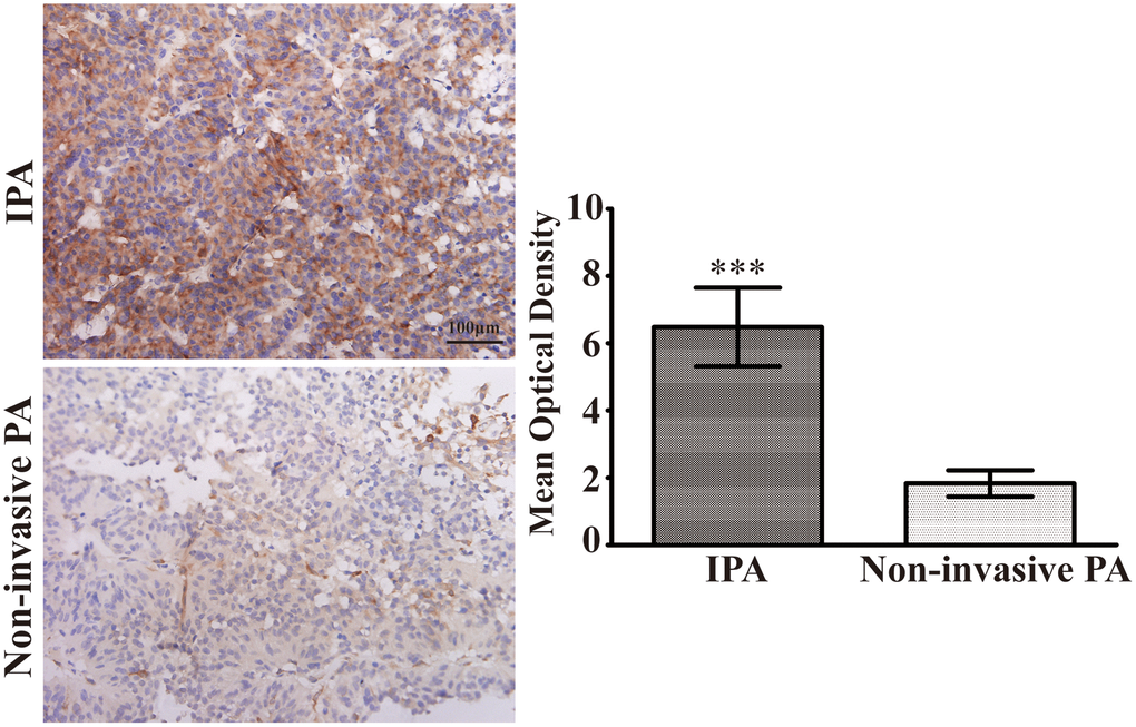Pituitary adenoma (PA) is a common neuroendocrine neoplasm and consists of 10-15% of primary tumors in central nervous system [1]. In spite of having benign nature, one third of PA manifests aggressive behaviors, resulting in infiltration of the cavernous sinus, sphenoid and dura [2]. Such tumors are defined as invasive pituitary adenoma (IPA). Owing to the large size of these tumors and serious destruction of adjacent structures, it is difficult to remove IPA completely, giving rise to the presence of residual tumor, high recurrence and poor prognosis [3]. Accordingly, it is indispensable to expand our understanding of PA molecular pathogenesis to develop novel targets for therapy.