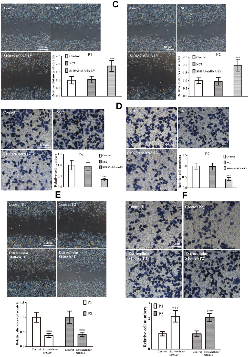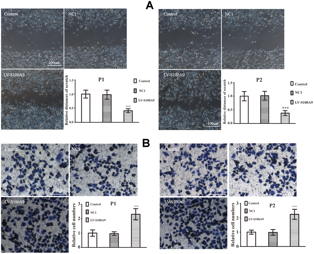 The primary PA cells P1 and P2 (Clinical information was listed in Table 3) were divided into control, NC1 and LV-S100A9 group. The wound-healing (Figure 6A) and transwell assay (Figure 6B) showed that upregulation of S100A9 enhanced migration and invasion, respectively. Next, the P1 and P2 cells were also divided into control, NC2 and S100A9-shRNA-LV group. Figure 6C, 6D suggested that knock down of S100A9 suppressed migration and invasion after 16h. Finally, 10μg/mL recombinant human S100A9 protein was added into P1 and P2 cells, the abilities of migration and invasion were increased in P1 and P2 cells by the extracellular S100A9 (Figure 6E, 6F).