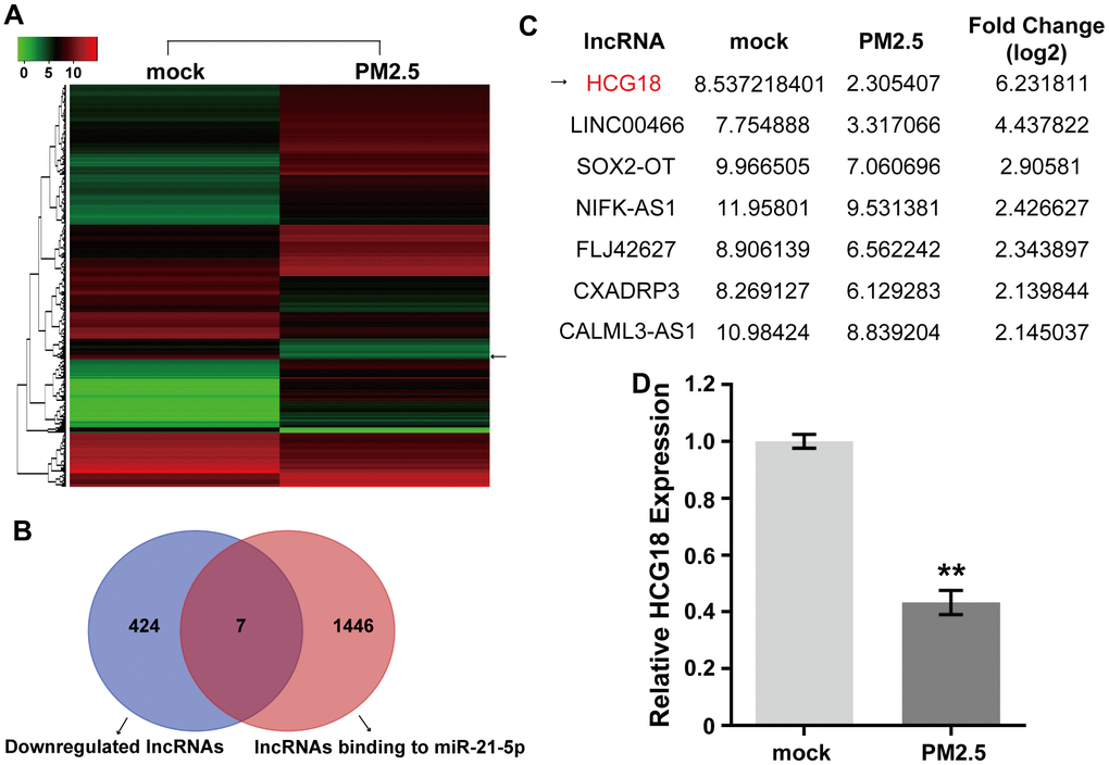Our previous report indicated that exposure to PM2.5 can induce vascular endothelial barrier dysfunction through STAT3-dependent up-regulation of miR-21-5p. LncRNAs can act as endogenous miRNA sponges by competitively binding to miRNAs and suppressing their expression and function [18]. To further investigate the regulatory mechanism involved in PM2.5-induced miR-21-5p overexpression during the increase in vascular permeability, the differentially expressed lncRNAs between PM2.5-treated and untreated HUVECs were detected using lncRNA microarray. The microarray data showed that 431 lncRNAs were down-regulated and 910 lncRNAs were up-regulated in PM2.5-treated HUVECs compared with the untreated group (Figure 1A). Furthermore, the possible lncRNAs that could bind to miR-21-5p were analyzed using a Venn diagram generated by an online tool (http://bioinformatics.psb.ugent.be/webtools/Venn/). Analysis of the lncRNA microarray results and Venn diagram identified 1453 candidate lncRNAs as functional ceRNAs that could bind to miR-21-5p; however, only 7 lncRNAs were significantly down-regulated by PM2.5 in HUVECs (Figure 1B). In addition, HCG18 was the most significantly down-regulated lncRNA among these 7 PM2.5-regulated lncRNAs predicted to bind to miR-21-5p (Figure 1C). Furthermore, the down-regulation of HCG18 by PM2.5 was confirmed by qRT-PCR in HUVECs (Figure 1D).