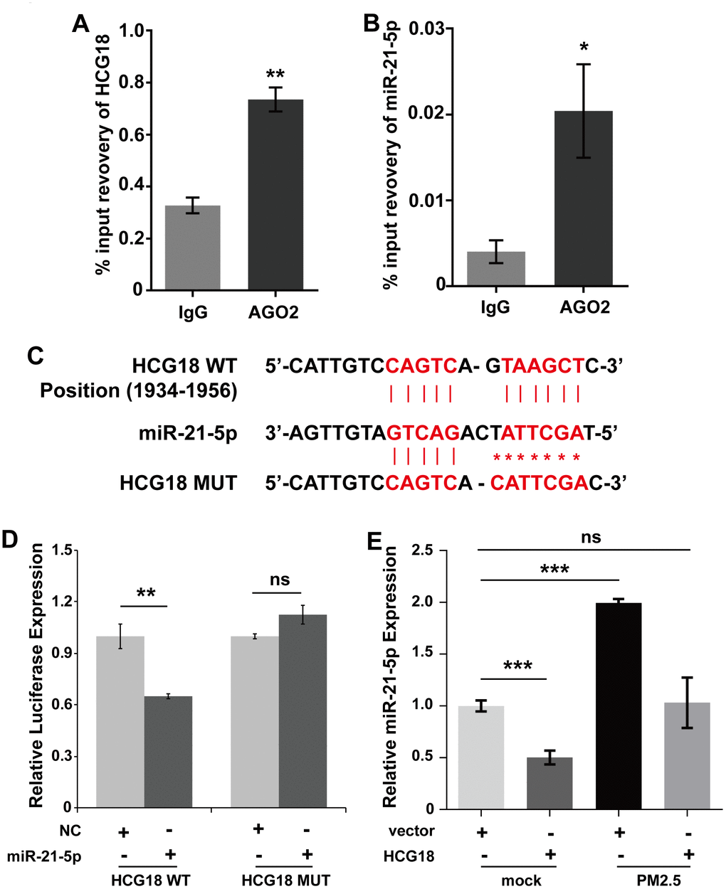 antibody RIP samples from HUVECs (Figure 2A, 2B). These results indicate that HCG18 and miR-21-5p are in the same AGO2 complex in HUVECs. Then, the binding relationship between HCG18 and miR-21-5p was further investigated. The predicted miR-21-5p binding sites within HCG18 were analyzed using the DIANA tool (http://carolina.imis.athena-innovation.gr/diana_tools/web/index.php) (Figure 2C). To further verify that HCG18 directly targets miR-21-5p, we performed luciferase reporter assays. The results revealed that miR-21-5p mimics markedly suppressed the luciferase activity of wild-type HCG18 (HCG18-WT) but not that of mutant HCG18 (HCG18-MUT) (Figure 2D). Together, these data suggest that HCG18 functions as a ceRNA for miR-21-5p in HUVECs. Next, we further clarified whether PM2.5 regulates the HCG18/miR-21-5p axis in HUVECs. The interaction between HCG18 and miR-21-5p in PM2.5-treated HUVECs was analyzed by qRT-PCR. The results showed that overexpression of HCG18 significantly inhibited miR-21-5p; however, the induction of miR-21-5p by PM2.5 could be abolished by overexpression of HCG18 in HUVECs (Figure 2E). Overall, we confirmed that PM2.5 can disrupt the balance of competitive binding between HCG18 and miR-21-5p in HUVECs.