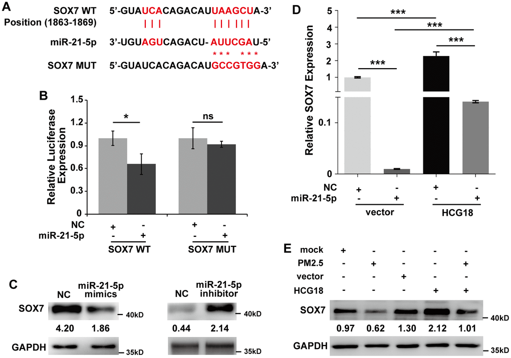 In addition, the endogenous protein expression of SOX7 regulated by miR-21-5p was detected using western blotting. The results showed that SOX7 was significantly inhibited by overexpression of miR-21-5p but was increased by suppression of miR-21-5p in HUVECs (Figure 3C). Simultaneously, we further clarified whether HCG18 regulated miR-21-5p/SOX7 signaling to form a ceRNA pathway in HUVECs. To this end, we detected the gene expression of SOX7 by qRT-PCR assay. As shown in Figure 3D, the mRNA level of SOX7 was significantly decreased by miR-21-5p and markedly increased by overexpression of HCG18 in HUVECs. Nevertheless, cotreatment with miR-21-5p and HCG18 abrogated the upregulation of SOX7 mRNA in HUVECs overexpressing HCG18 (Figure 3D). Overall, the HCG18/miR-21-5p/SOX7 axis could form a ceRNA pathway in HUVECs. Next, we further determined whether PM2.5 regulates the HCG18/miR-21-5p/SOX7 ceRNA pathway in HUVECs. The results showed that PM2.5 clearly suppressed SOX7 expression, and HCG18 positively regulated SOX7 expression in HUVECs (Figure 3E). In addition, the decreased expression of SOX7 by PM2.5 could be reversed by overexpression of HCG18 in HUVECs (Figure 3E). These data further confirmed that the HCG18/miR-21-5p/SOX7 pathway was involved in the regulatory effect of PM2.5 in HUVECs.
