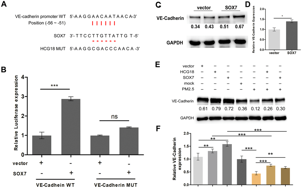 It has been demonstrated that SOX7 can transcriptionally activate mouse VE-cadherin in the hemogenic endothelium [19]. However, whether SOX7 regulates human VE-cadherin transcription by binding to the promoter region remains to be further confirmed. Our previous report indicated that miR-21-5p could indirectly inhibit the expression of VE-cadherin in HUVECs [6]. Therefore, we speculated that HCG18/miR-21-5p/SOX7 signaling may target VE- cadherin in PM2.5-treated vascular endothelial cells. First, a conserved SOX binding site from position -56 to -51 was found in the human VE-cadherin promoter (Figure 4A). We then performed a luciferase reporter assay to detect whether SOX7 could directly act on the promoter region. The SOX7 expression plasmid and the VE-cadherin promoter reporter vector, which included the SOX binding sites, were cotransfected into HEK293T cells. As shown in Figure 4B, the luciferase levels were increased 3-fold by the presence of SOX7, and the effect was abolished when the binding sites in the promoter region were mutated. We further detected the protein expression of VE-cadherin using western blotting and found that the expression of VE-cadherin was significantly upregulated when SOX7 was overexpressed in HUVECs (Figure 4C). In addition, overexpression of HCG18 promoted the expression of VE-cadherin, and the induction effect was abrogated by both overexpression of HCG18 or SOX7 and treatment with PM2.5 (Figure 4E). Together, these results show that SOX7 can transcriptionally regulate the expression of VE-cadherin, and HCG18/miR-21-5p/SOX7/VE-cadherin signaling is regulated by PM2.5 in HUVECs.