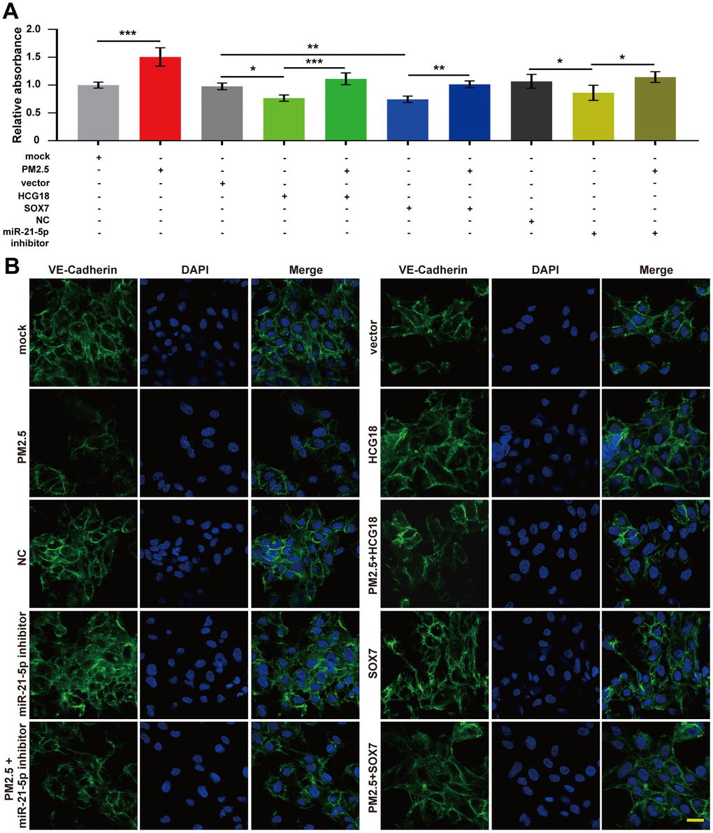 HUVECs was on the coverslips and transfected with the expression plasmids of HCG18 or SOX7 or miR-21-5p mimics, and then treated with PM2.5. Cells were fixed in 4% polyoxymethylene and permeated in 1% Triton X-100. Then, cells were blocked using 1% BSA and incubated with rabbit anti-VE-cadherin antibody and Alexa Fluor 488 donkey anti-rabbit IgG (H+L) (Life Technology, USA). Following it, cells were stained with DAPI and photographed using a Laser scanning confocal microscope (Axio-Imager_LSM-800, ZEISS).