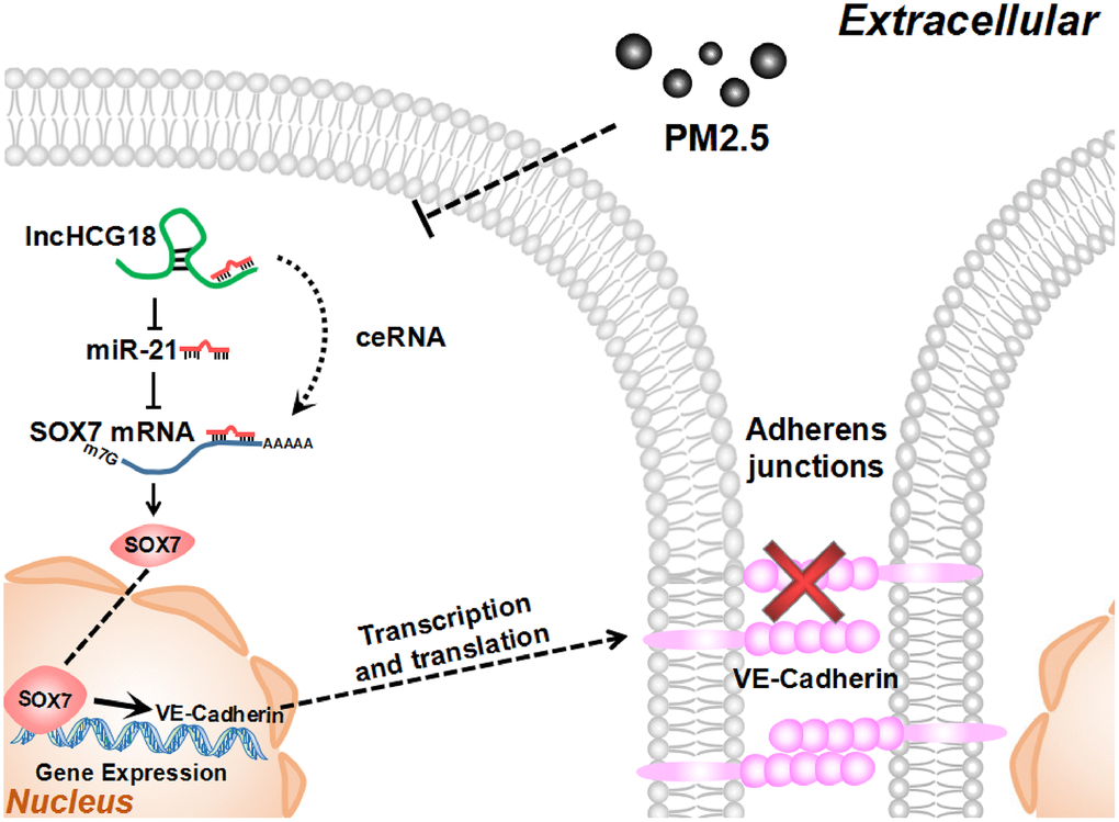 Our previous study demonstrated that miR-21-5p is involved in PM2.5-induced endothelial permeability increase by indirectly inhibiting VE-cadherin expression [6]. We hereby aimed to explore the potential lncRNA that could sponge miR-21-5p during PM2.5-mediated vascular endothelial barrier dysfunction and the regulatory mechanism between miR-21-5p and VE-cadherin. First, microarray analysis was utilized to identify the lncRNA HCG18 that might be involved in PM2.5-induced miR-21-5p overexpression. Next, we used luciferase reporter assays and RNA immunoprecipitation (RIP) to confirm that HCG18 functions as a competing endogenous RNA (ceRNA) by sponging miR-21-5p. Then, we found that SOX7 is a target of miR-21-5p and that it can transcriptionally regulate VE-cadherin expression. Our findings suggest that inhibition of HCG18 promotes PM2.5-mediated vascular endothelial barrier dysfunction by sponging miR-21-5p.