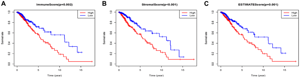 Figure 1. Associations of immune (A), stromal (B), and ESTIMATE (C) scores on overall survival in Grade II/III gliomas.