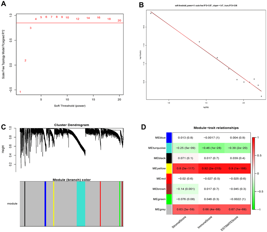 Figure 2. Determination of soft-thresholding power and identification of modules associated with ESTIMATE scores in WGCNA. (A) Analysis of the scale-free fit index for various soft-thresholding powers (β). (B) Checking the scale-free topology when β=6. (C) Dendrogram of all differentially expressed genes clustered based on a dissimilarity measure (1-TOM). (D) Heatmap of the correlation between module eigengenes and clinical traits of Grade II/III glioma cancer.