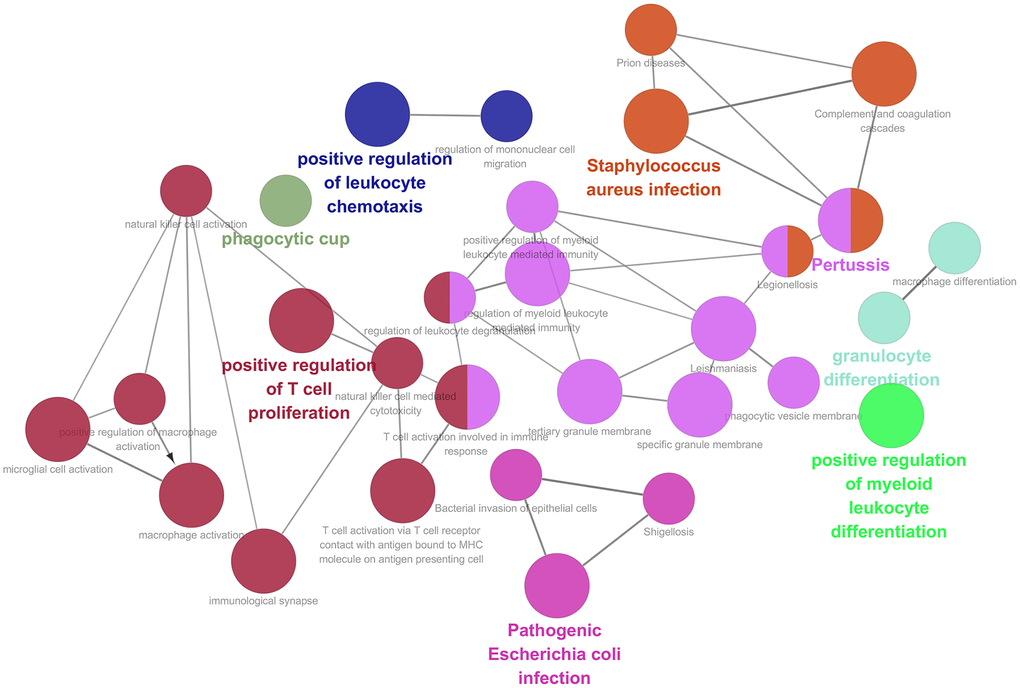 Figure 3. Function enrichment analysis based on PPI network. Functional annotations indicated that 46 genes in yellow modules were mostly involved in positive regulation of leukocyte chemotaxis, T cell proliferation and myeloid leukocyte differentiation.
