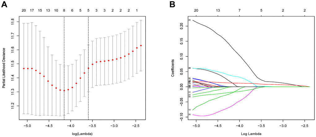The Least Absolute Shrinkage Sum Selection Operator (LASSO) is an analysis method that accurately sets the regression coefficients of many irrelevant features to zero, thereby reducing interference variables. It is an important method and has many applications in regression analysis [59, 60]. The LASSO regression analysis was performed by R package ‘glmnet’. In the analysis, genes in the module which is positively related to ESTIMATE scores were used as the input. Eight genes were got from the LASSO regression. Then, multivariate Cox regression analysis was performed to evaluate the weight coefficient of the genes and constructed a prognostic risk model.