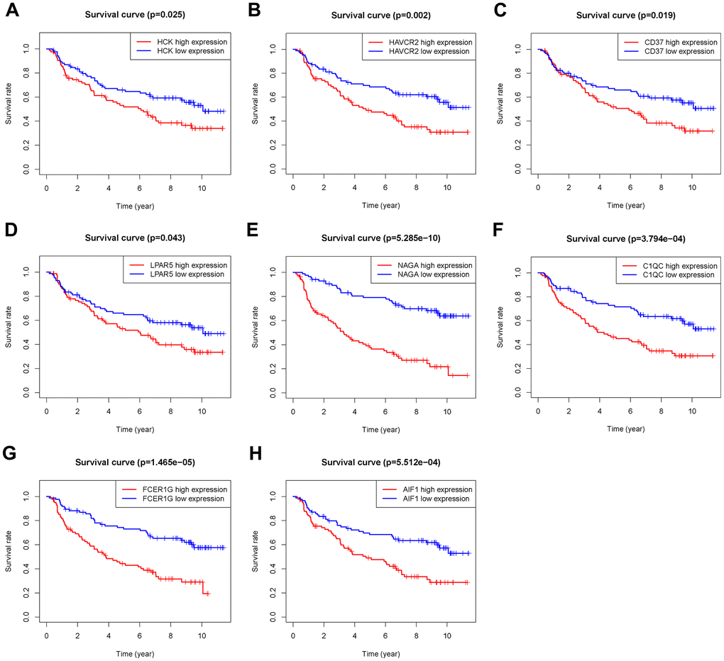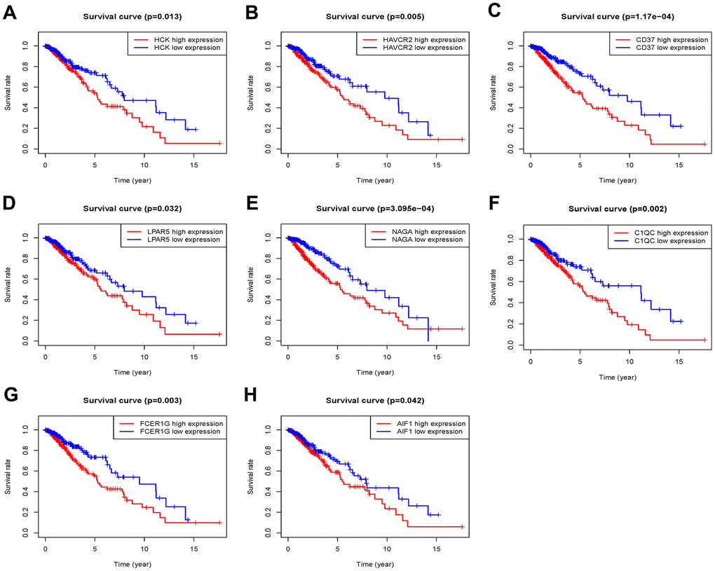 Figure 5. Overall survival of genes in Grade II/III glioma patients in the TCGA cohort. (A) HCK. (B) HAVCR2. (C) CD37. (D) LPAR5. (E) NAGA. (F) C1QC. (G) FCER1G. (H) AIF1.