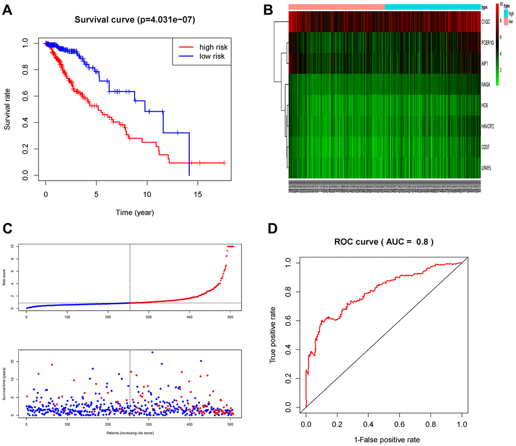 Figure 7. Prognostic analysis of the TCGA cohort. (A) Kaplan-Meier curve analysis of the high-risk and low-risk groups. (B) Expression patterns of risk genes in the prognostic model. (C) Risk score distribution of patients in the prognostic model and survival status scatter plots for patients in the prognostic model. (D) ROC curve analysis of the prognostic model.