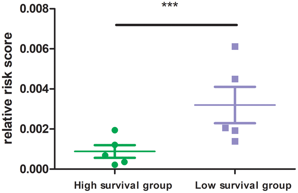 In experimental verification, we randomly selected 10 cases with a follow-up time of more than 3 months, and divided them into two groups according to their survival time (5 patients per group). All sample information is shown in the Supplementary Table 1. QPCR experiment was carried out to measure the mRNA expression of 8 MRGs in the ten patients. The results showed that the high survival group had lower risk score than that of the low survival group (Figure 8; P<0.001). This experiment verified the good clinical application value from another aspect of our MRGs signature.