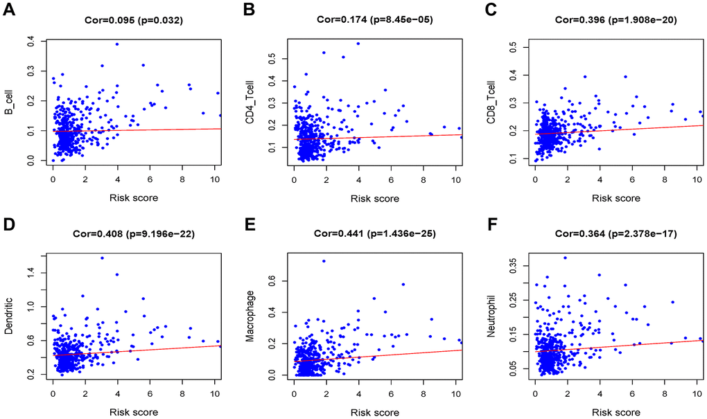 Figure 9. Analysis of the correlation between the risk score and immune cell infiltration in the TCGA cohort. (A) B cells. (B) CD4+ T cells. (C) CD8+ T cells. (D) Dendritic cells. (E) Macrophages. (F) Neutrophils.
