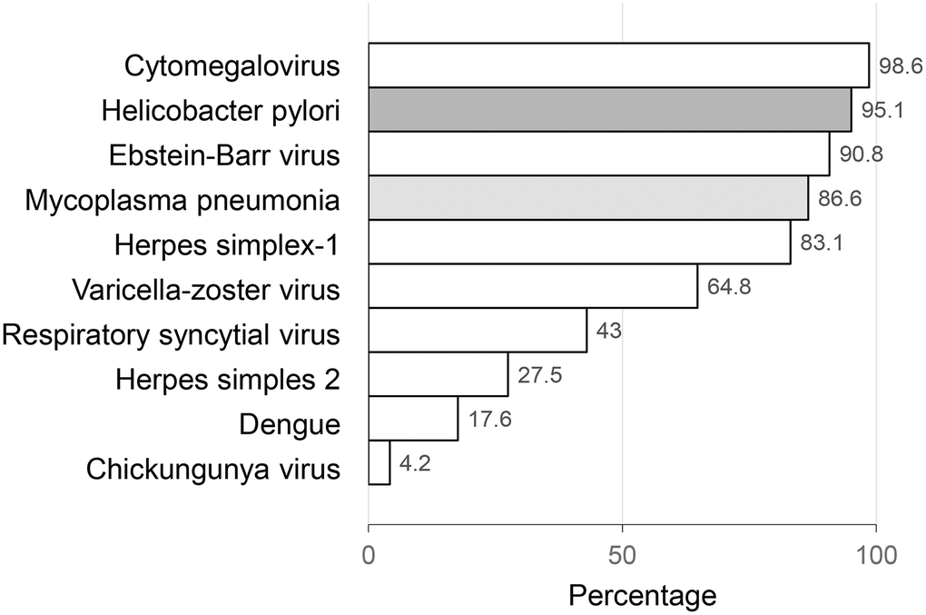The mean age of the study participants was 72.7 years (range: 57-92). The mean PL count was 6.1 (SD=1.2), individually ranging from 3 to 9. The most common pathogens (CMV, H. Pylori, EBV, M. Pneumoniae, and HSV-1) were prevalent in 80 to 99% of the participants, while other pathogens were prevalent in less than 65% of the participants, with the least prevalent pathogen being Chikungunya virus (4.2%). Figure 1.