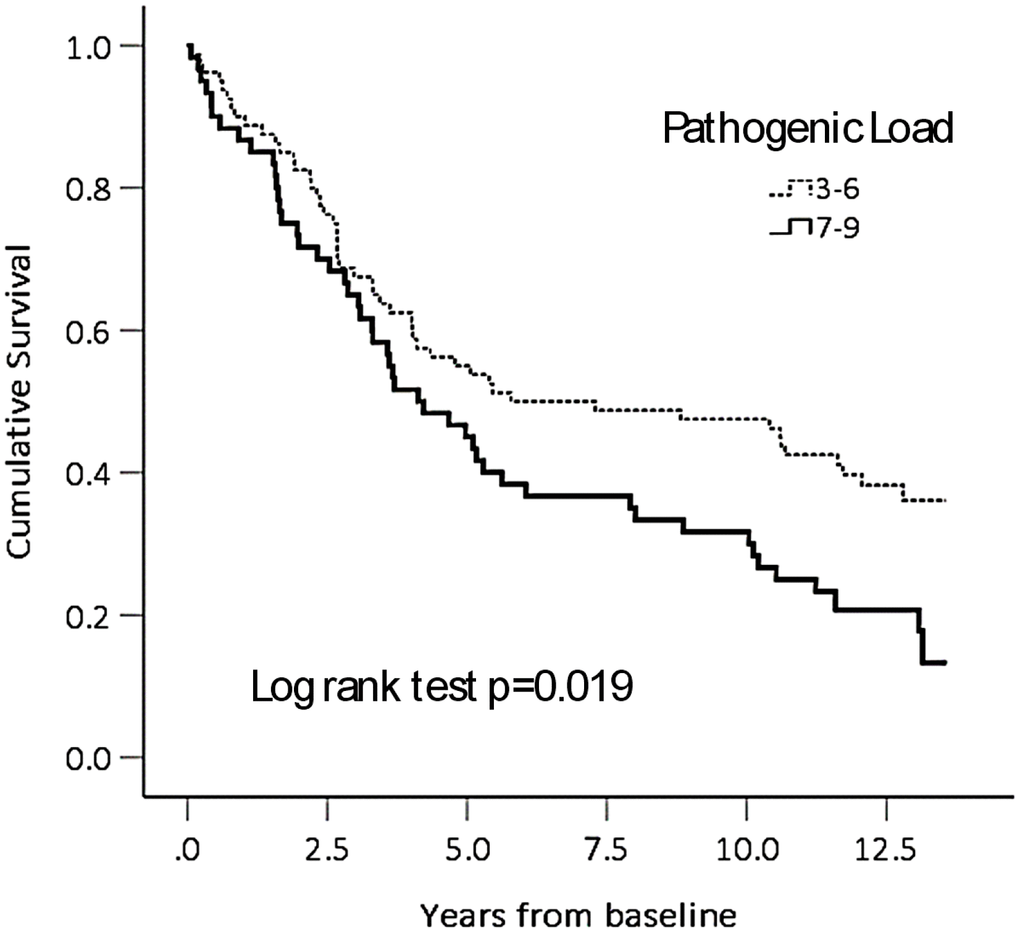 Differences in demographic and clinical variables between the two pathogenic load groups were assessed using χ2 tests for categorical variables and analyses of variance (t-test) for continuous variables. Comparisons of the mean scores of the CD-FI and the estimated differences between the two pathogenic load groups were performed using analyses of variance in regression analyses that controlled for sex, age, education, smoking and alcohol history. Estimates of the associations between pathogenic load and the prevalence of the physical phenotype components were performed using logistic regression, controlling for the same confounding variables. Cox regression analysis was used to estimate the hazard ratio of association between pathogenic load and mortality, controlling for confounding variables. All analyses were performed using IBM SPSS statistical software version 25.