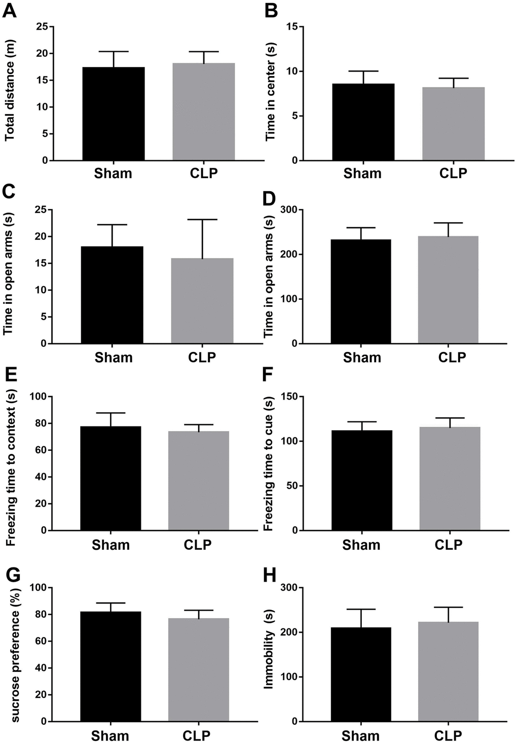 The open field test was performed to investigate whether LPS influences locomotor activity and anxiety-like behavior. As shown in Figure 9A, 9B, LPS had no effect on the total distance traveled. However, roscovitine treatment significantly increased total distance traveled in the LPS + roscovitine group compared with LPS group (F2,31 = 4.054, P = 0.0273). There was no difference in time spent in the center of the open arena among groups (F2,31 = 0.7745, P = 0.4696). In the elevated plus maze, there was a trend toward a decreased time in the open arms (F2,31 = 3.264, P = 0.0517, Figure 9C). In addition, no difference in time in the closed arms was observed between groups (F2,31 = 1.593, P = 0.2194, Figure 9D). However, CLP did not significantly affect total distance traveled (t = 0.1962, P = 0.8462, Figure 10A) or time spent in the center (t = 0.2069, P = 0.838, Figure 10B) when compared with the sham group. In addition, there was no difference in the time in the open (t = 0.2585, P = 0.7985, Figure 10C) or closed arms (t = 0.6287, P = 0.536, Figure 10D) between the two groups.