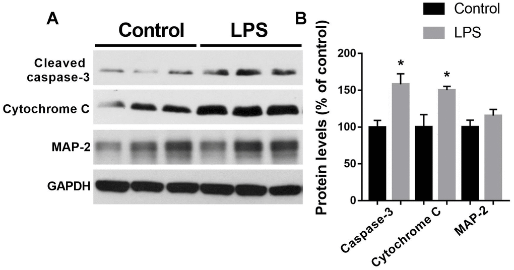 Next, we performed some of the functional changes with regarding to apoptosis, mitochondria dysfunction, and microtubule formation. As shown in Figure 3, we showed that LPS induced significantly increased expressions of cleaved caspase-3 (t = 3.413, P = 0.0143) and cytochrome C (t = 2.844, P = 0.0294) in the hippocampus as compared with the control group, two markers of apoptosis and mitochondria dysfunction, respectively. However, there was no difference in microtubule-associated protein such as microtubule-associated protein-2 (MAP-2) between the control and LPS groups (t = 1.241, P = 0.2609).