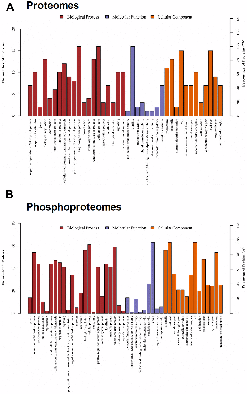 Figure 2A shows the design for proteomic and phosphoproteomic analysis. We used the iTRAQ approach and performed large-scale quantitative analysis. We identified 25045 unique peptides and 4163 proteins from each sample. Significant differences in protein expressions were determined by the following threshold: “P ≤ 0.05 and fold change ≥ 1.2 or <0.83”, which has been adopted by previous study [9]. Accordingly, 16 proteins showing significant changes were observed in hippocampal samples between control and LPS-exposed mice (Figure 2B and Table 1). Briefly, Rars2, Clic6, Rttn, Gtpbp10, Itgb7, Hbb-bh0, Sept10, Mmp1a, Eml1, Krt8, Ubqln4, Serpini1, Ca5b, Elmo1, Gng10 were significantly upregulated, while Smad1 was downregulated. These differentially expressed proteins were displayed using a heatmap (Figure 2D). Gene ontology (GO) classification showed these differentially expressed proteins involved in different molecular function categories, and participated in many biological processes (Figure 4). The GO data provided an overview showing that abundant changes are exhibited by changes in structural protein, extracellular matrix, membrane protein composition, and enzyme catalytic activities following LPS challenge.
