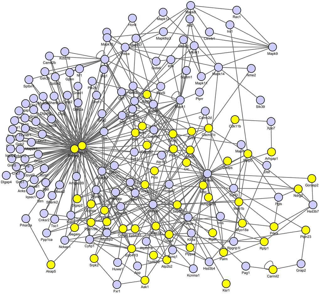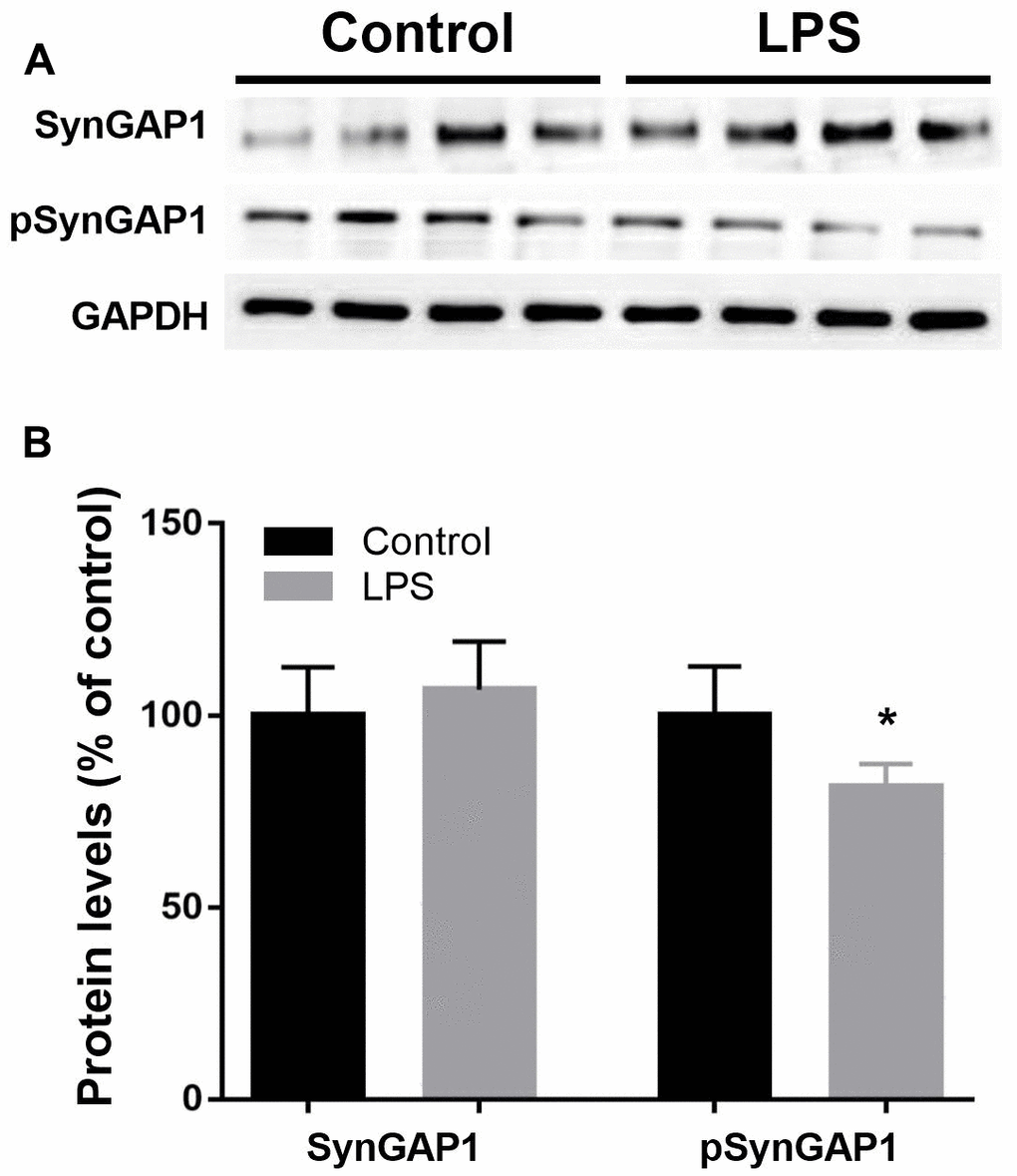 Next, we constructed pathological protein–protein interaction (PPI) networks based on significantly changed phosphoproteins. As shown in Figure 5, nodes indicate proteins with increased or decreased phosphorylation and the proteins directly connected to the altered proteins in the PPI database (blue). In particular, we detected SynGAP1 is among the hub of synaptic plasticity. To further verify the reliability of the iTRAQ results, we examined SynGAP1 and pSynGAP1 levels using the western blot approach (Figure 6). Although SynGAP1 was not affected (t = 0.7615, P = 0.4725), we showed that pSynGAP1 in the hippocampus was significantly decreased in LPS-exposed mice (t = 2.632, P = 0.039), suggesting the iTRAQ results in the present study were reliable.