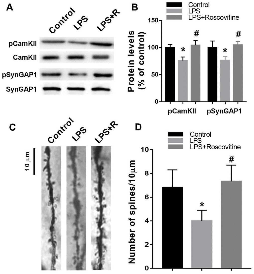 Decreased hippocampal pCamKII, pSynGAP levels, and dendritic spine density following LPS challenge were rescued by roscovitine