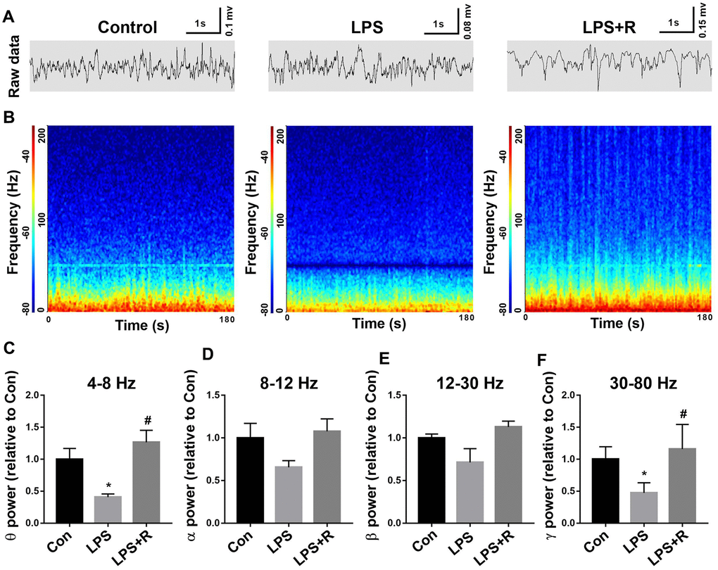 Electrophysiological recordings and analysis were performed as we previously described [40]. Mice were anesthetized with 2% sodium pentobarbital in saline (40 mg/kg, i.p.; Sigma, St Louise, MO, USA) and fixed in a stereotaxic apparatus on a temperature-regulated heating pad set to maintain body temperature at 36–37 °C. After surgical preparation and craniotomies, local field potentials (LFP) were recorded from hippocampal CA1 region (2.1 mm posterior, 1.5 mm lateral, and 1.5mm depth) using a 8-channel microwire array. All electrodes were joined to a miniature connector and were then fixed to the skull using dental acrylic. After 7-day recovery period, LFP were recorded continuously (sampling rate = 1000 Hz; bandpass filter = 1–400 Hz) when the animals explored in the open arena. The recorded LFP were filtered by a 50 Hz notching filter to remove the powerline artifact. At the end of recordings, animals were deeply anesthetized and brains were removed and fixed for verification of electrode placement. All data analyses were performed by Neuroexplorer (Plexon Inc., Dallas, TX) software.