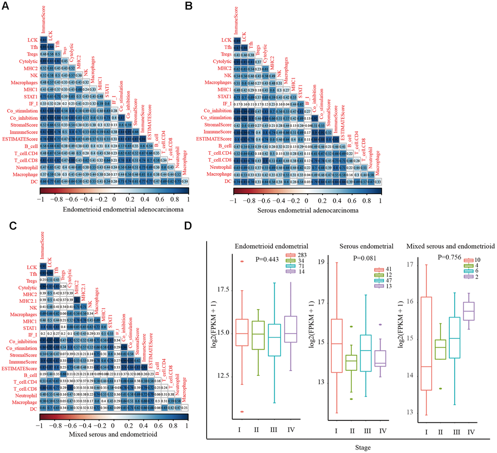 Stromal cells, immune cells, and ESTIMATE scores were predicted by expression profile data using the ESTIMATE R package. Gene expression data were obtained from patients with different EC subtypes in TCGA database, and the correlation (cor) between the scores in patients and different immunoglobulin genes was calculated using the Spearman correlation coefficient (Figure 1A–1C). Functional annotation of the immune-system-related metagene clusters is presented in Supplementary Table 1. The endometrioid cohort in TCGA database is divided into three subtypes: endometrioid endometrial adenocarcinoma, serous endometrial adenocarcinoma, and mixed serous and endometrioid. In the three EC subtypes, except for the neoantigen score, the LCK metagene score showed a significant positive correlation with other types of immune-related scores: endometrioid endometrial adenocarcinoma (cor = 0.84), serous endometrial adenocarcinoma (cor = 0.83), and mixed serous and endometrioid (cor = 0.85). Next, we analyzed the distribution of the LCK metagene levels in three EC subtypes at different clinical stages of EC. The results revealed no significant differences in LCK metagene expression at different clinical stages (Figure 1D). Patients with each EC subtype were divided into two groups of high expression and low expression of LCK to analyze the prognosis of each group (Figure 2A–2C). We observed no significant differences in LCK metagene expression between the three subtypes in (Figure 2D). Furthermore, the prognostic analysis results showed that in the endometrioid endometrial adenocarcinoma subtype group, the survival rate of patients with high LCK metagene expression was markedly higher than that of the low expression group.